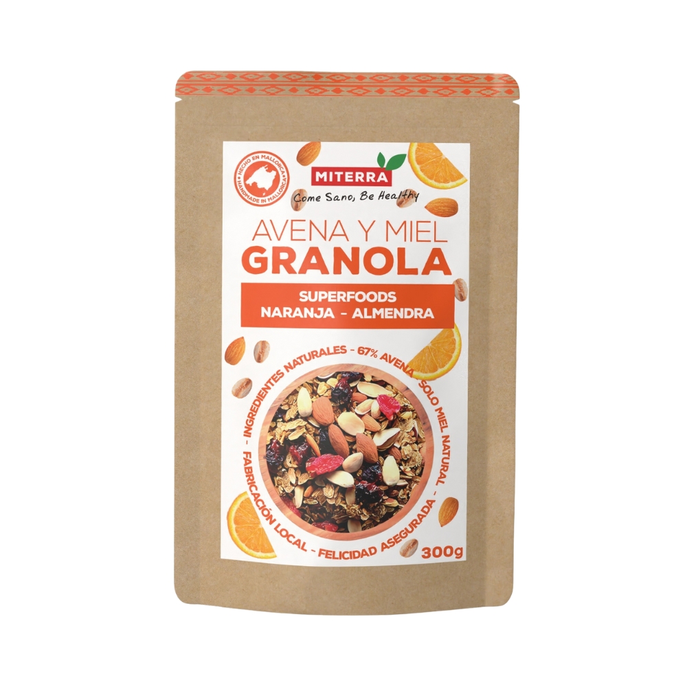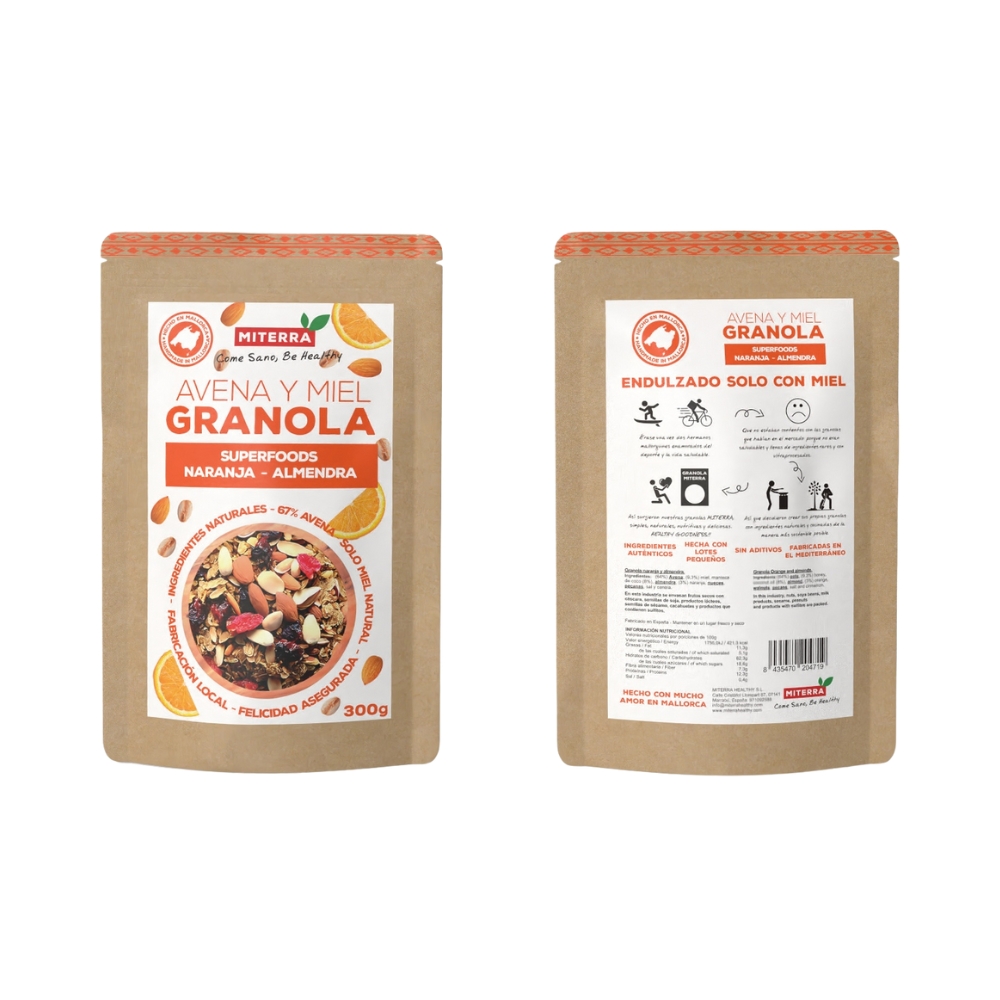 La almendra tostada y la naranja mediterránea se encuentran con un sutil toque de algarroba para crear una granola cálida y luminosa. Endulzada solo con miel, ofrece un sabor redondo y natural. Perfecta para desayunos pausados al sol, cuando quieres equilibrio, aroma y tradición en cada cucharada.