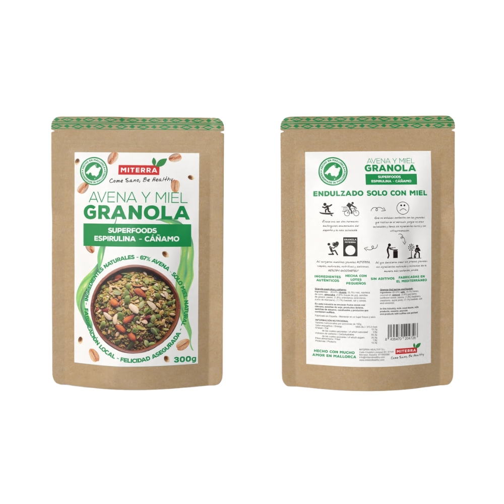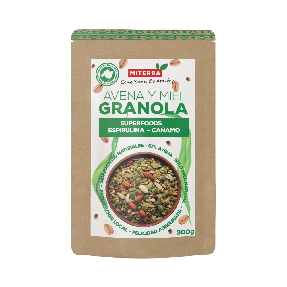 Semillas seleccionadas y espirulina se combinan en Mallorca para crear una granola vibrante, nutritiva y naturalmente equilibrada. Endulzada únicamente con miel, aporta frescura, textura y un impulso vegetal lleno de carácter. Ideal para empezar el día con claridad, energía limpia y la sensación de estar cuidándote de verdad.